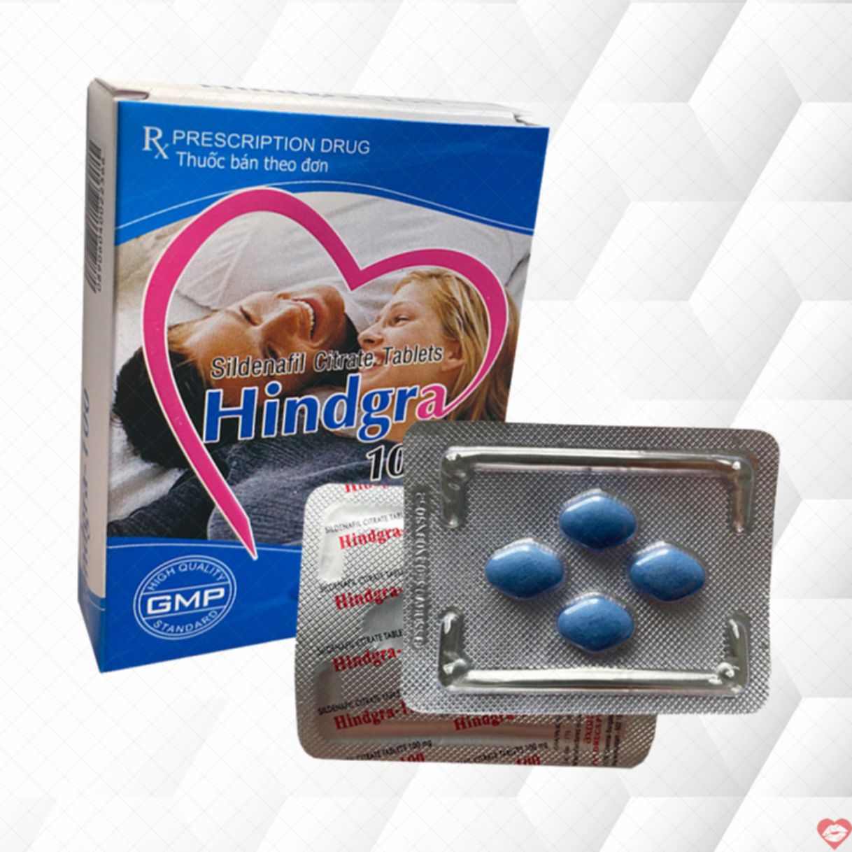 Thuốc Hindgra-100 giá bán lẻ được bào chế dưới dạng viên nén bao phim hình thoi xưởng , 2 mặt lồi bỏ sỉ , màu xanh xuất khẩu . Mỗi viên nén chứa 10mg Sildenafil Citrat showroom và tư vấn các loại tá dược khác.